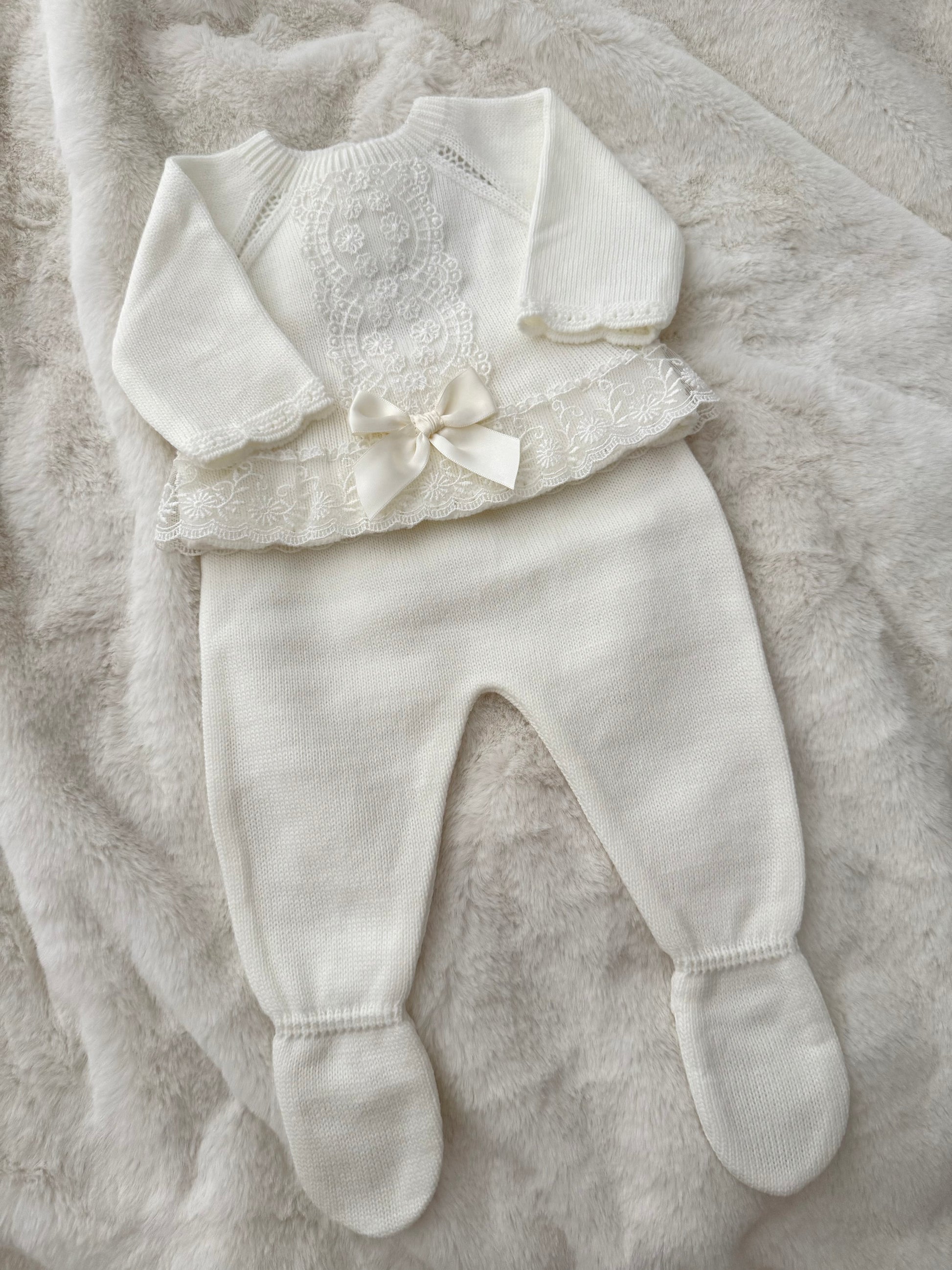 A beautiful & soft cream knit for your baby girl with lace detailing. Paired with a matching bonnet for a classic look.
